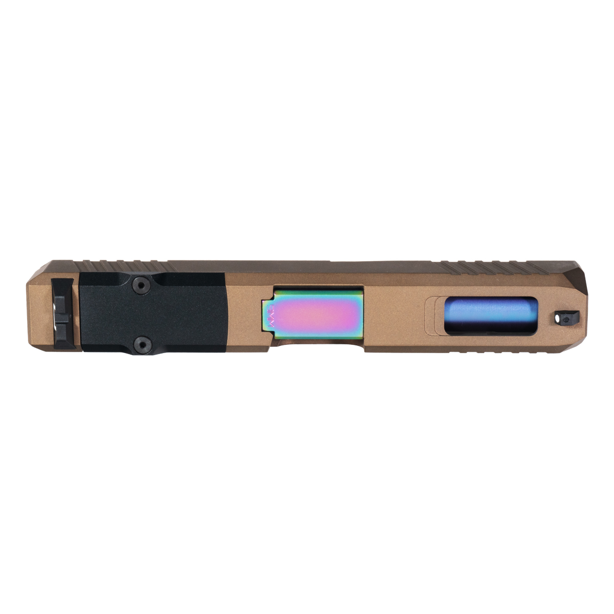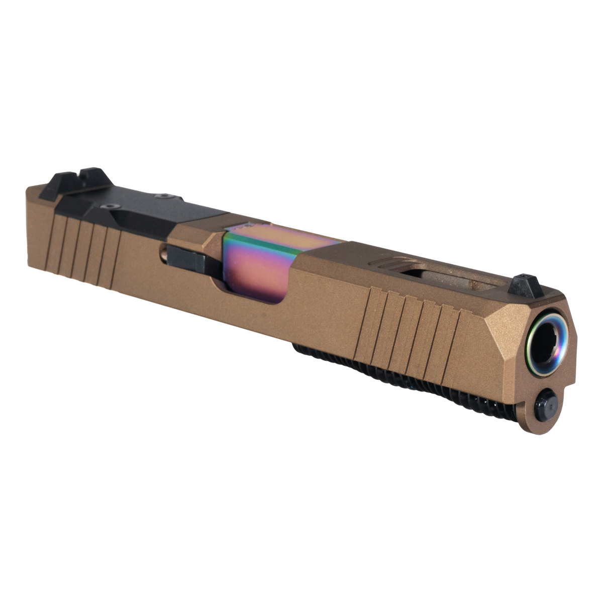 The DTT Stiffler MFG Wayfinder Crowned Rainbow PVD Barrel G19 Gen 1-3 Compatible Slide Kit is engineered for Glock 19 enthusiasts seeking reliability and visual appeal. Constructed from 17-4 stainless steel, the slide features a burnt bronze Cerakote finish that provides an optimal blend of durability and aesthetics. It includes an RMR cut for optics mounting with a cover plate, catering to modern shooting preferences.