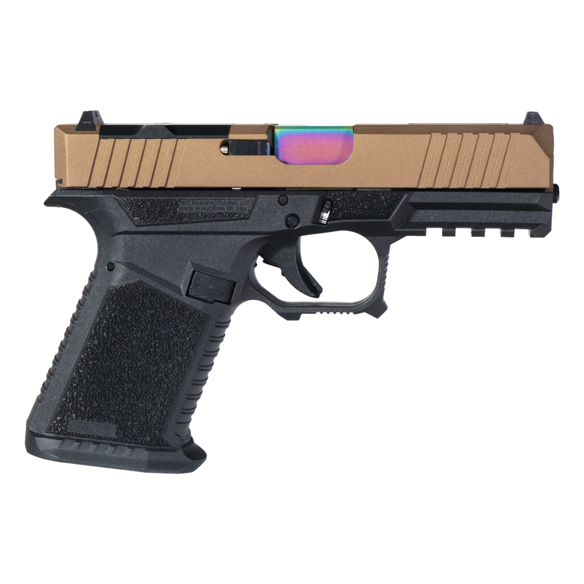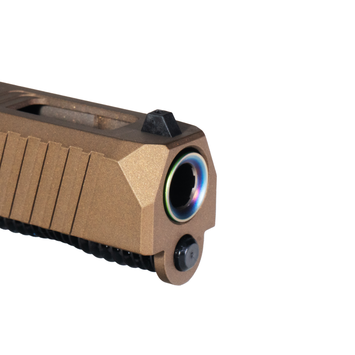 The complete kit also includes a flush cut crowned barrel made from 416R stainless steel with a PVD finish in a striking rainbow color. The barrel is chambered for 9MM (9x19) and has a twist rate of 1:10. This slide kit not only meets the functional requirements of precision performance but also adds a unique visual statement to your G19 Gen 1-3 platform, making it a compelling choice for gunsmiths and firearm enthusiasts alike.