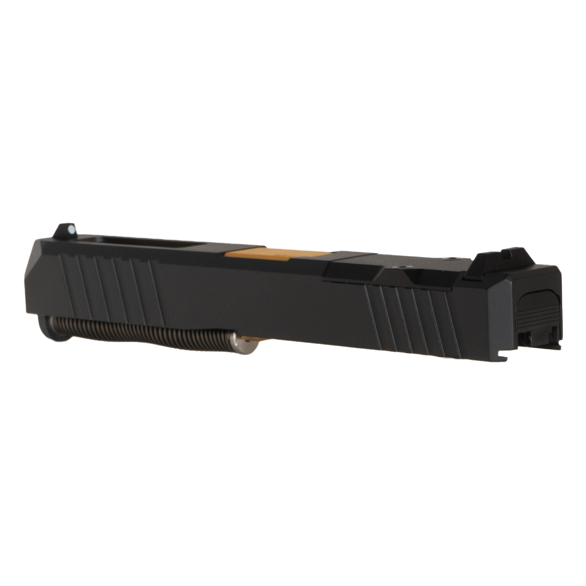 The Wayfinder Gold TiN Barrel G17 Gen 1-3 Compatible 9MM Black RMR Complete Slide Kit from DTT Stiffler MFG features precision-engineered components for improved performance and reliability. Designed for Glock 17 Gen 1-3, this complete assembly includes a Turbo Slide made from heat-treated 17-4 stainless steel, ensuring strength and durability.