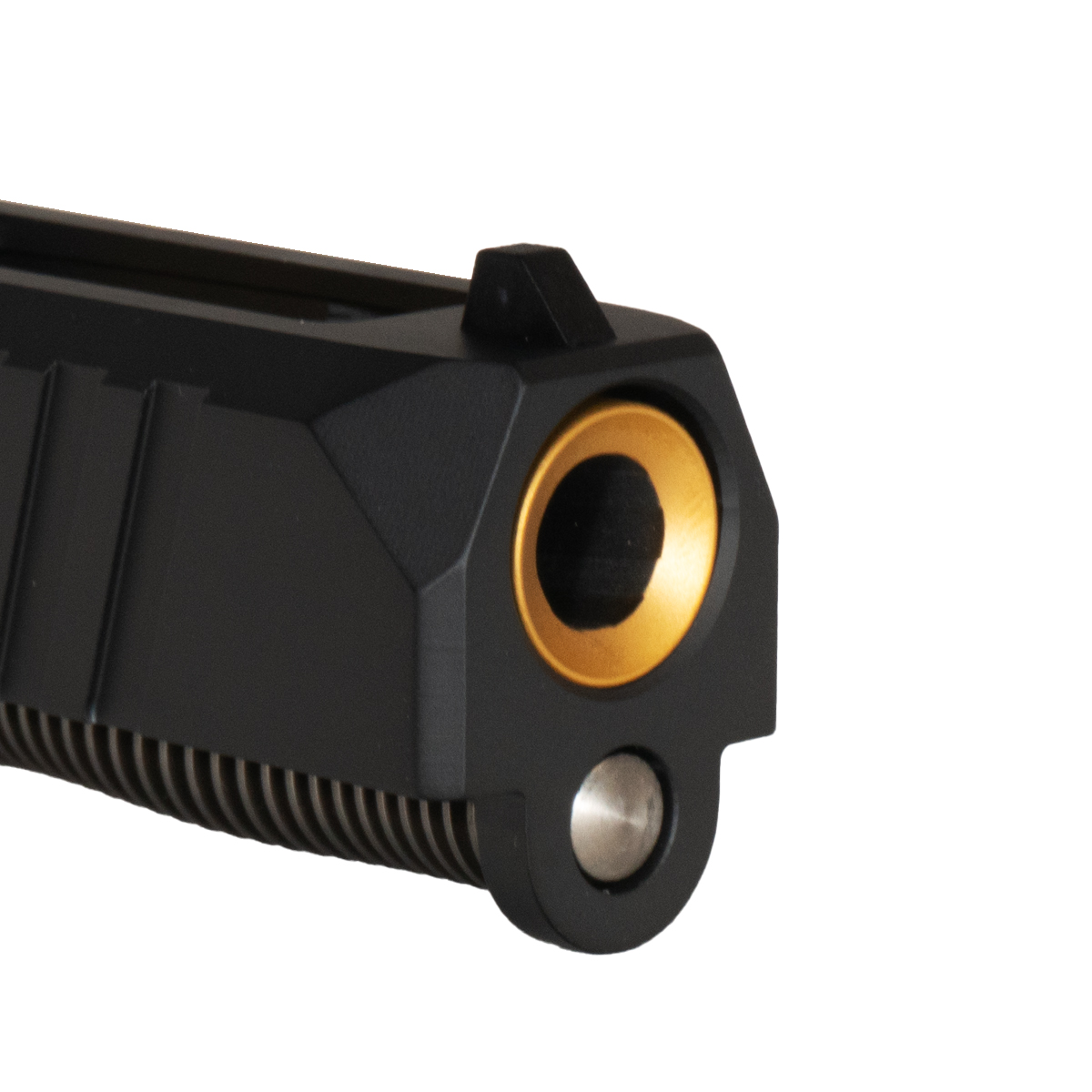 The slide is finished in a corrosion-resistant Graphite Black Cerakote and boasts an RMR cut for seamless compatibility with Trijicon RMR optics. The top window cut reduces weight while adding a distinctive look, and the front and rear serrations provide a secure grip for slide manipulation. The kit includes a Gold TiN barrel, crafted from 416R stainless steel with a 1:10 twist rate, offering reliable performance in 9mm caliber. A slide cover plate is included for those who prefer to run the firearm without an optic. This complete slide kit is ideal for gunsmiths seeking functional upgrades.