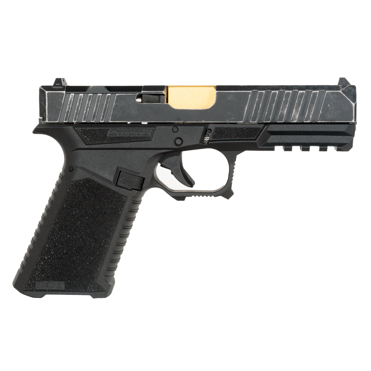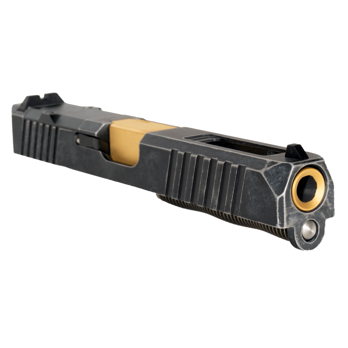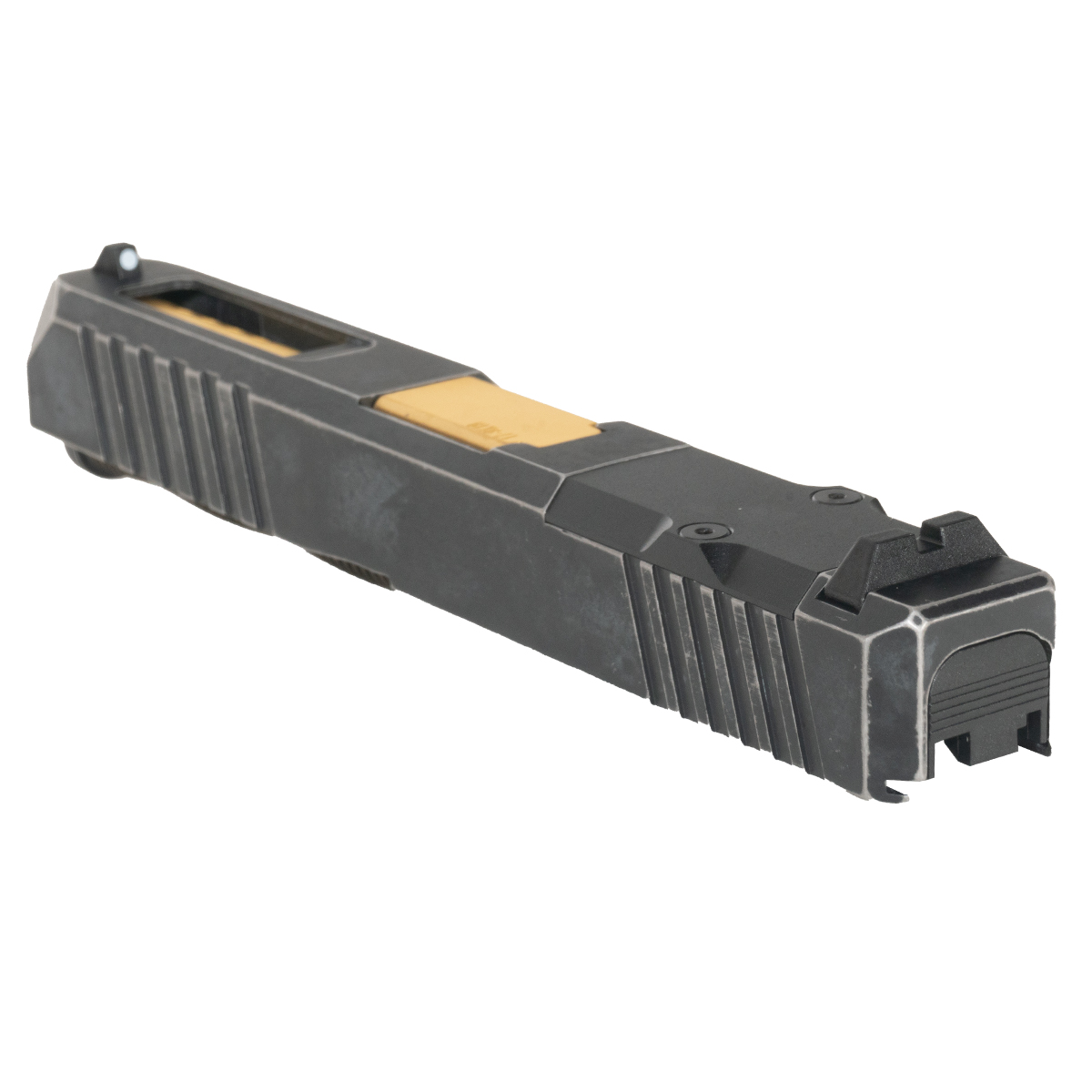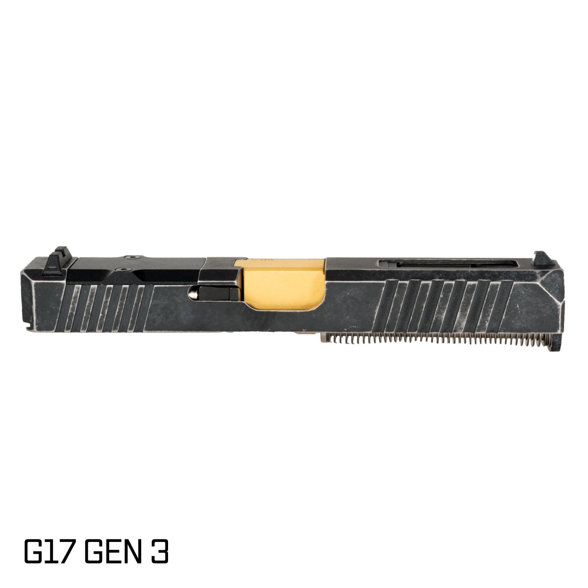 The Wayfinder Gold TiN Barrel G17 Gen 1-3 Compatible 9MM Space Worn RMR Complete Slide Kit from DTT Stiffler MFG offers a precision-engineered solution for Glock 17 enthusiasts. This complete slide kit is compatible with generations 1 through 3 of the Glock 17 platform and is chambered for the 9mm (9x19) caliber. The slide features a unique Space Worn finish, protected by a durable Cerakote layer. An RMR cut is included for easy mounting of optics.