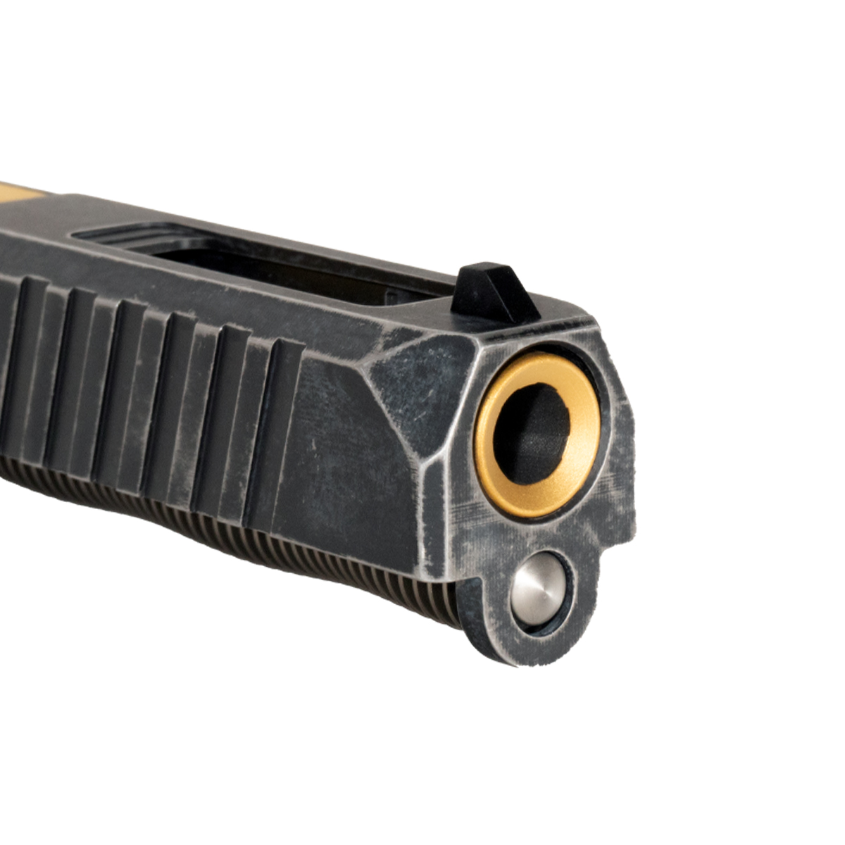 Accompanying the slide is a G17 Gen 3 compatible barrel made from 416R stainless steel, coated in a striking Gold TiN finish. The barrel offers enhanced performance while adding an aesthetic touch to your firearm. The kit also includes a short sight assembly plastic kit, designed for effortless installation. Perfect for the gunsmith who values precision and freedom in their craft.