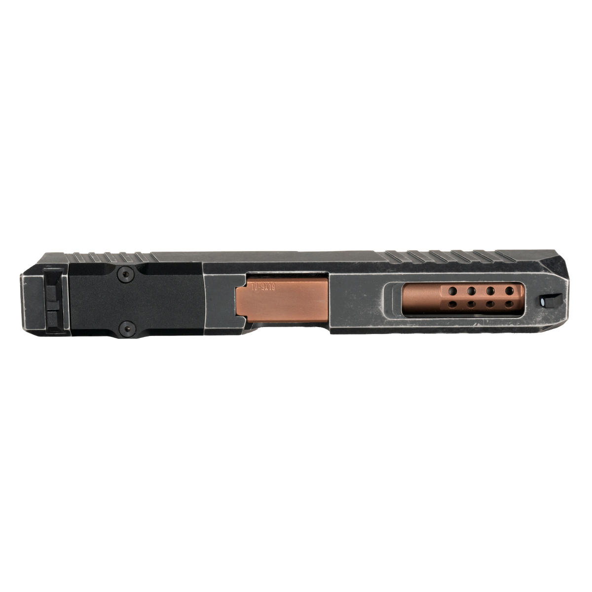 The Wayfinder Ported Copper PVD Barrel G17 Gen 1-3 Compatible 9MM Space Worn RMR Complete Slide Kit from DTT Stiffler MFG offers a high-performance upgrade for Glock enthusiasts. This kit is crafted to fit Glock 17 models across Generations 1 to 3, chambered in 9mm (9x19). The barrel features a durable PVD finish, while the slide boasts a robust Cerakote finish, ensuring both aesthetics and resilience. Constructed from high-quality steel for the barrel and 17-4 stainless steel for the slide, the kit promises reliability and longevity.