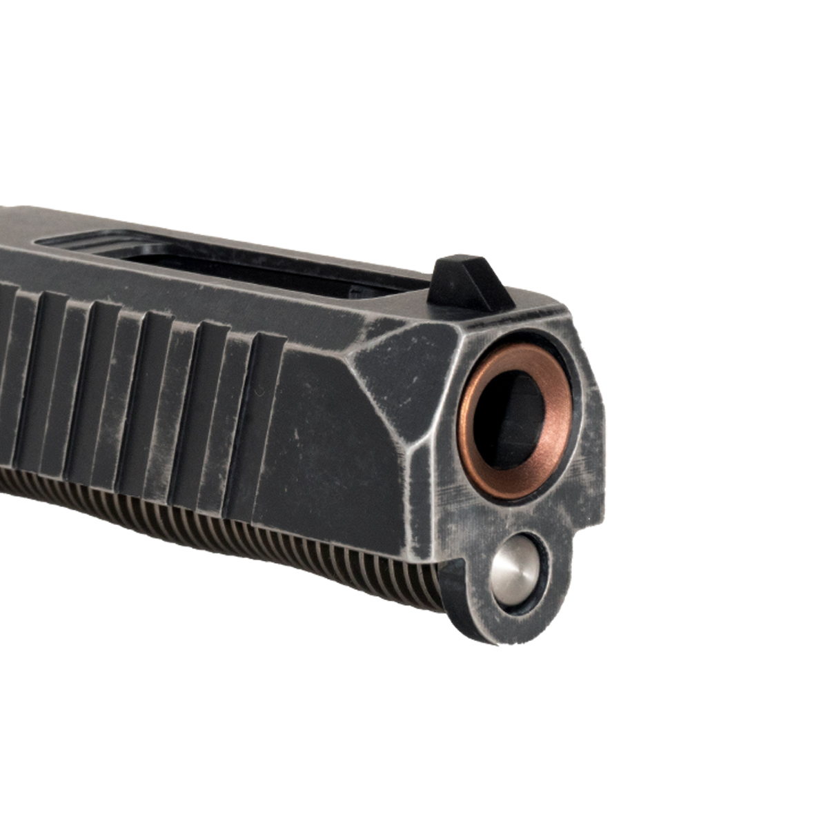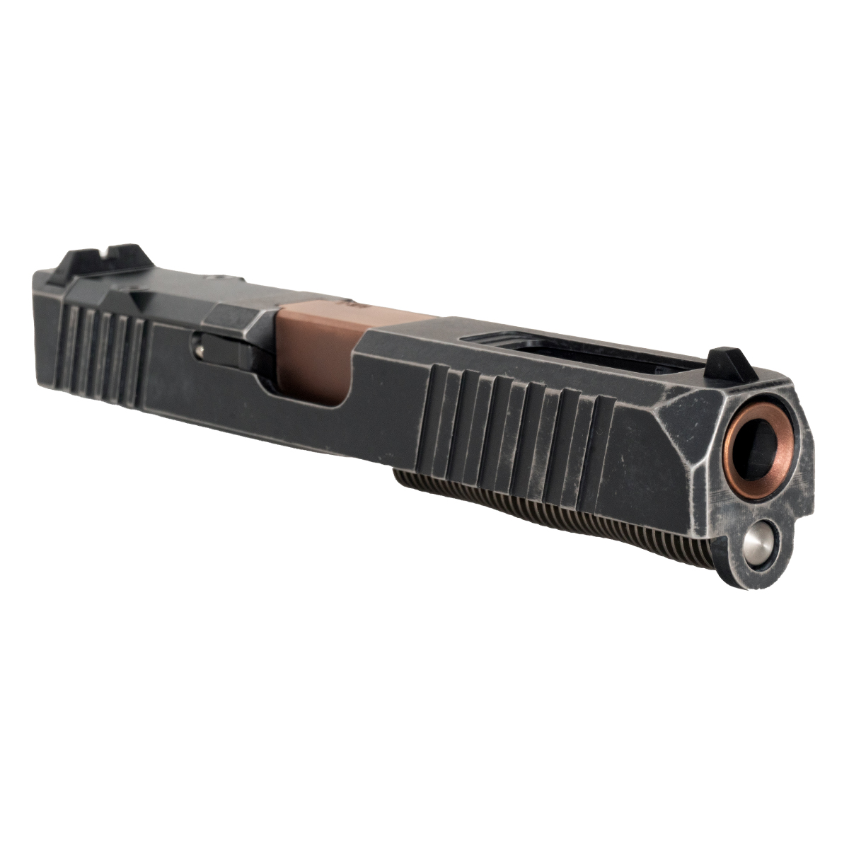 The slide features an RMR cut for easy optics mounting, ideal for tactical applications. It showcases a unique Space Worn color scheme, paired with a striking copper barrel. The included 13 lb reduced recoil spring facilitates smoother cycling. This complete slide kit empowers gunsmiths seeking accuracy, customization, and unmatched performance.