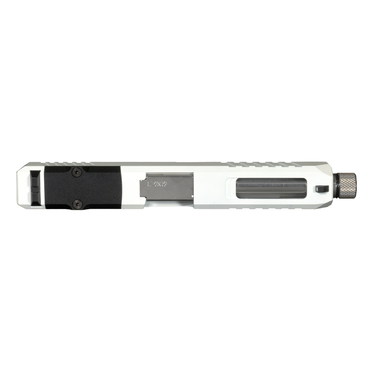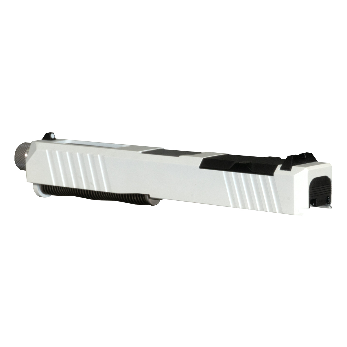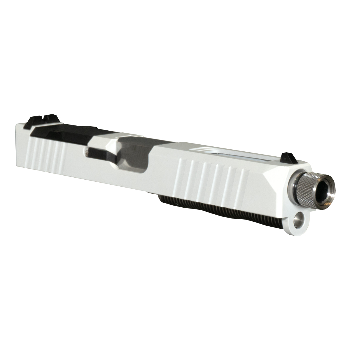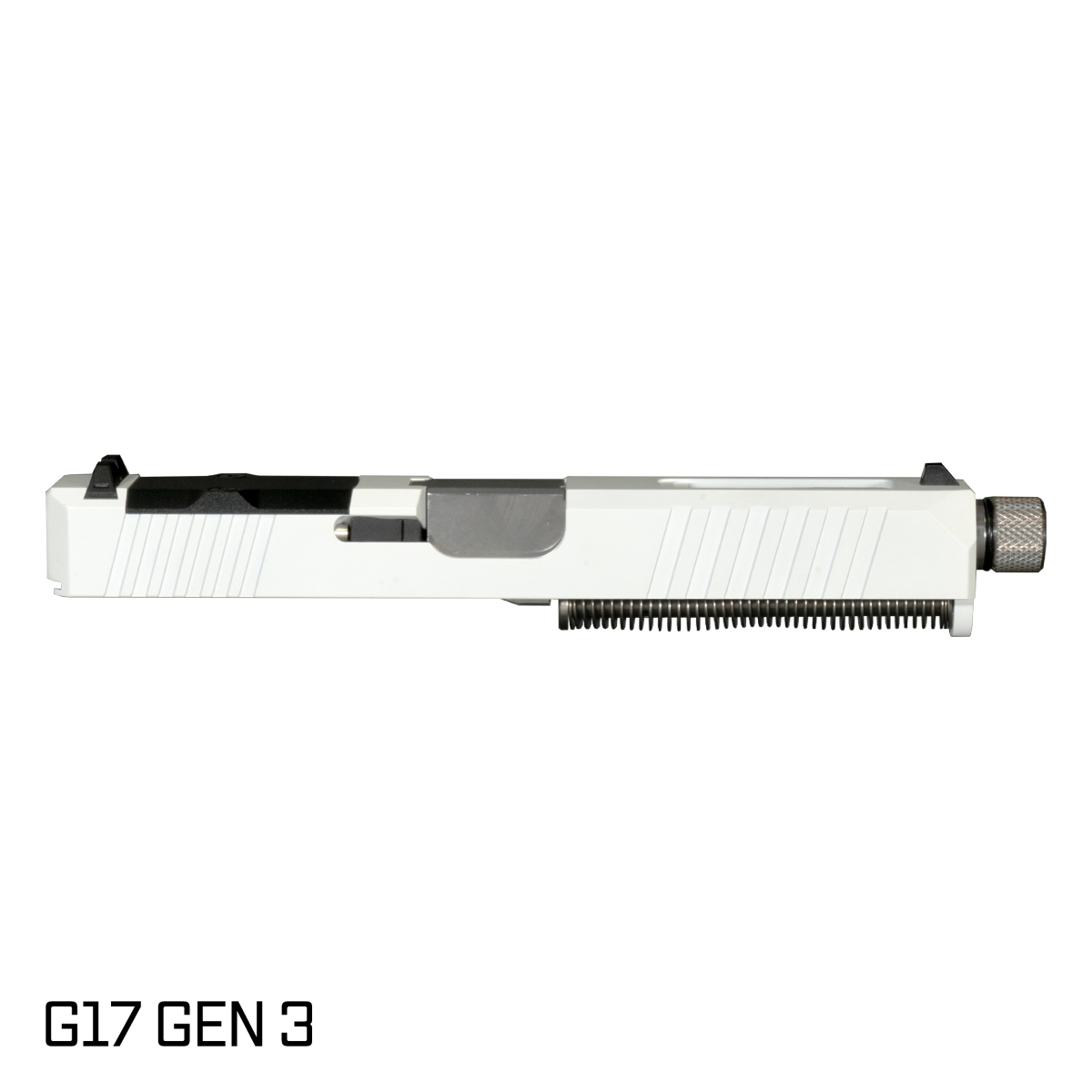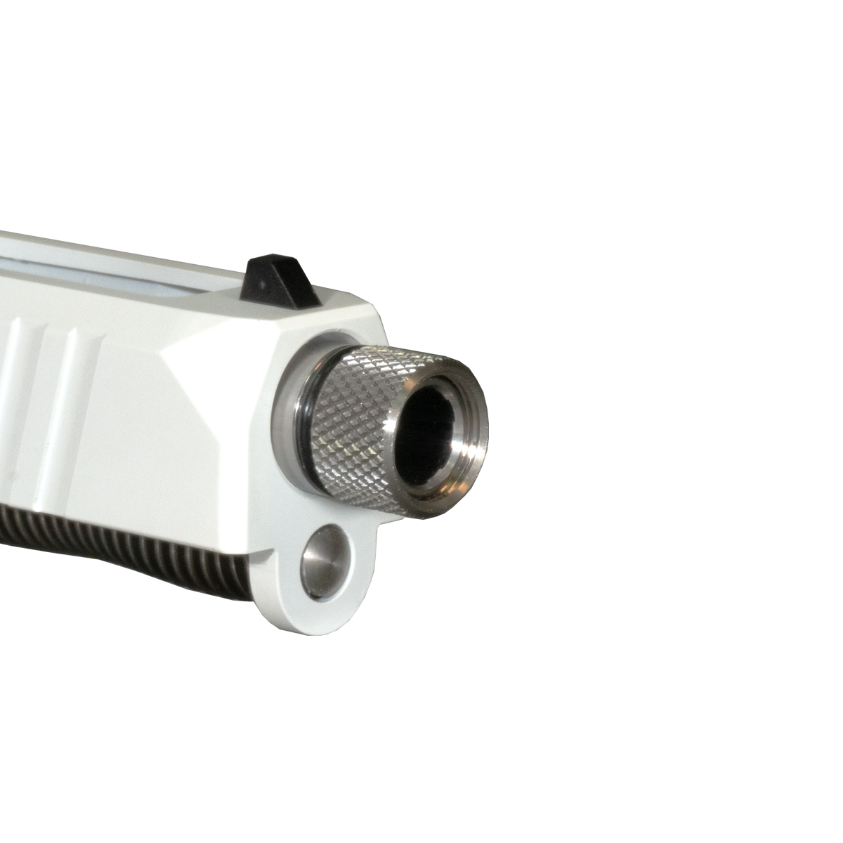 The Wayfinder Threaded Polished Stainless Barrel G17 Gen 1-3 Compatible 9MM White RMR Complete Slide Kit from DTT Stiffler MFG is engineered for Glock 17 models from generations 1 to 3. This kit features a stripped Turbo Slide finished in a striking White F-Series Cerakote, offering a distinctive aesthetic. It includes aggressive front and rear serrations for improved handling. The RMR cut allows for seamless integration with Trijicon RMR optics, enhancing versatility for precision shooting.