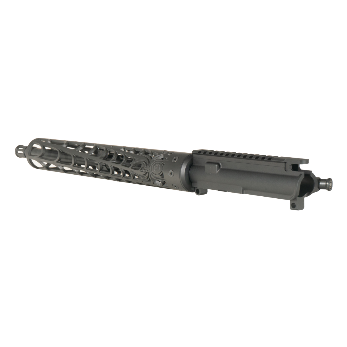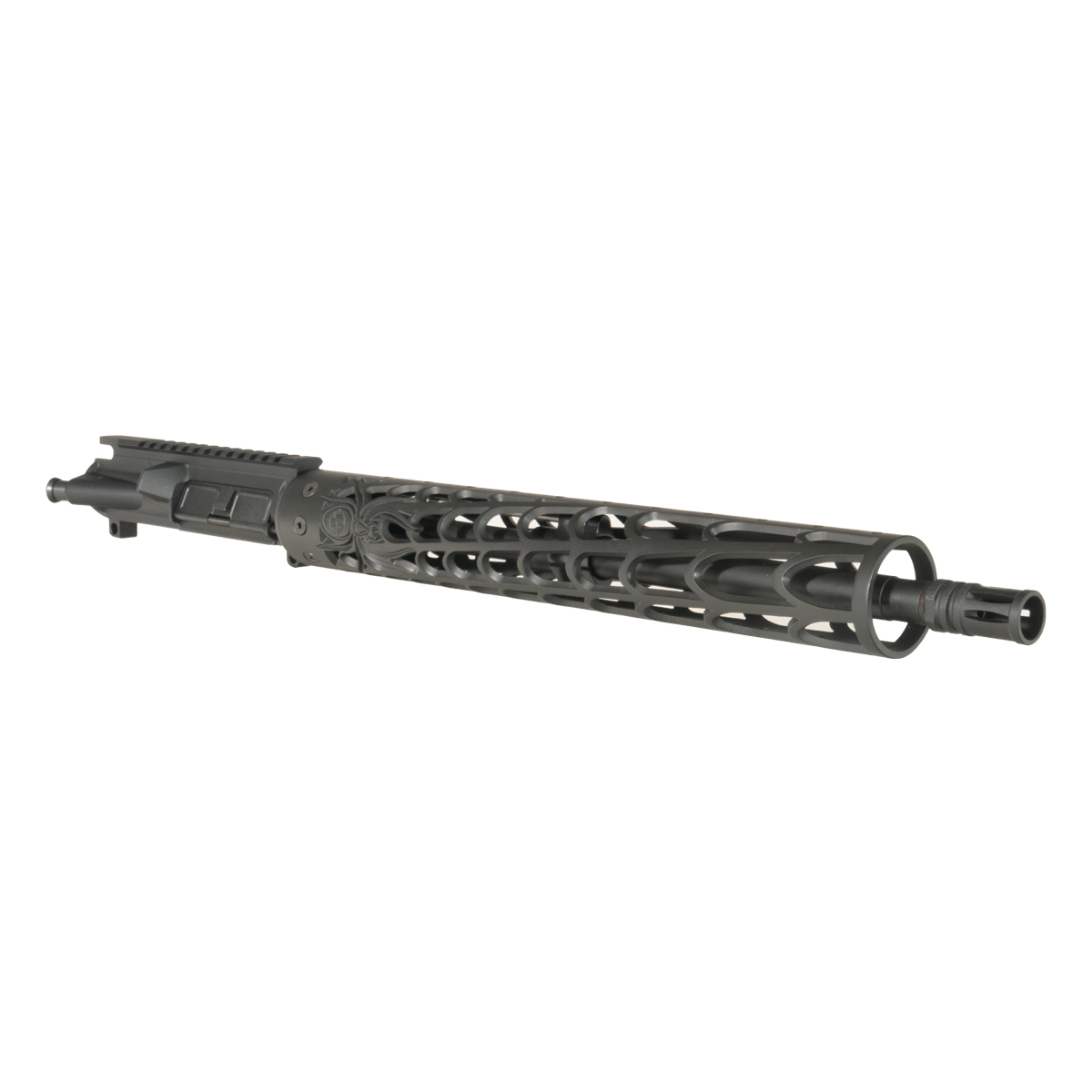 The upper receiver is machined from 7075-T6 aluminum with an anodized finish and M4 feed ramp compatibility. The Unique-ARs 15-inch Web handguard provides accessory mounting options along its length without contact with the barrel or gas system components.