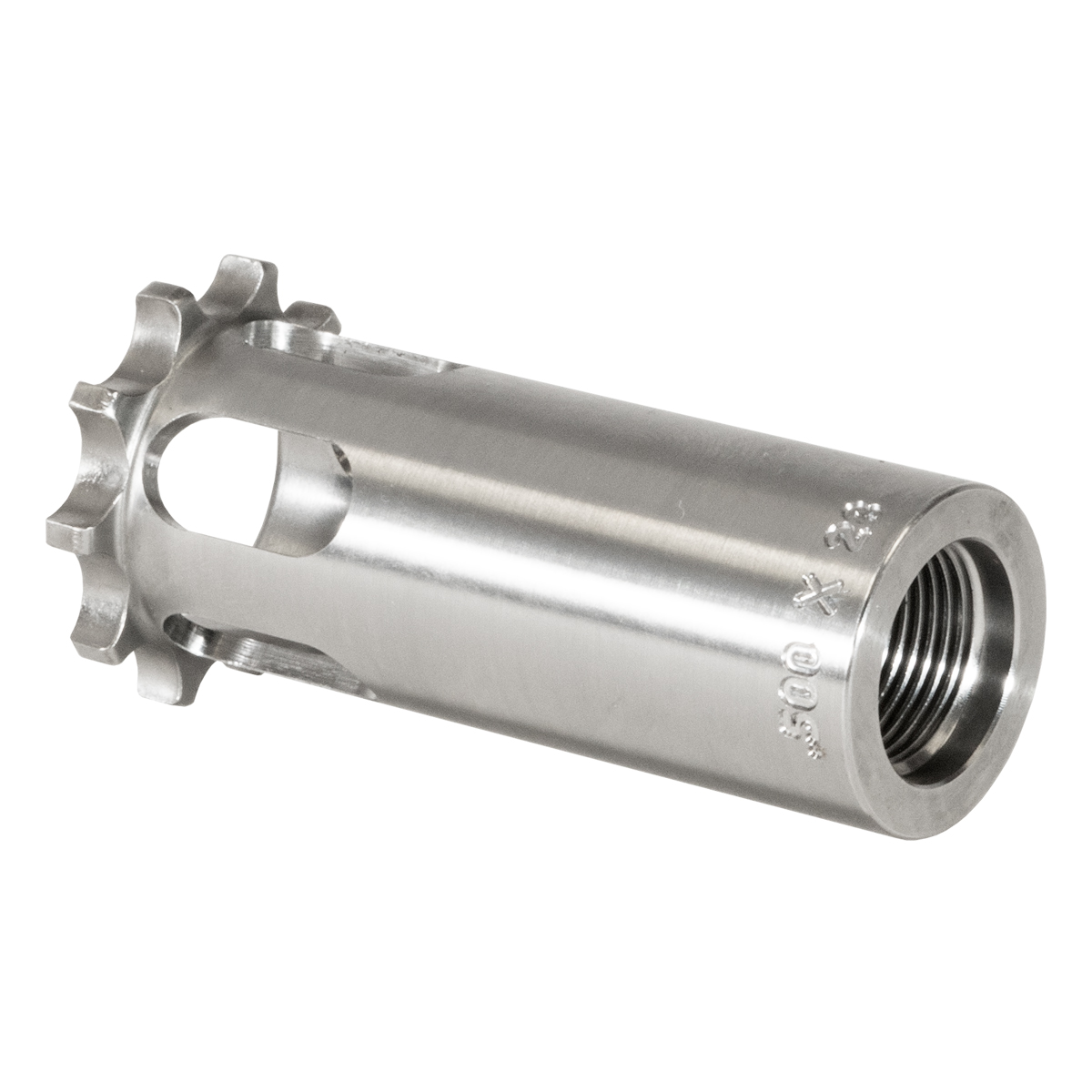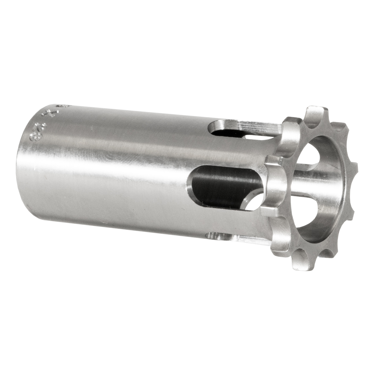 This Nielsen booster piston features heat-treated 17-4 stainless steel construction with 1/2x28 threading for 9mm applications. The piston includes 10 index points for point-of-impact tuning and is compatible with YHM Booster Assembly, YHM Sidewinder M2 suppressors, and many popular pistol suppressors. Interchangeable with pistons from YHM, SilencerCo, Rugged, and Dead Air Odessa pattern. Made in the USA.